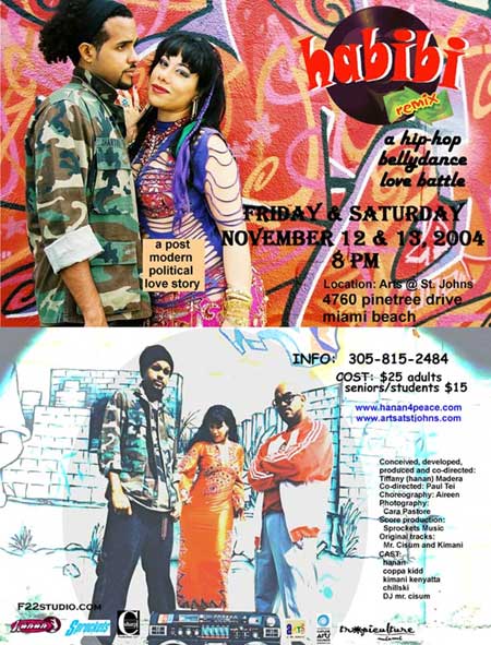 The HABIBI REMIX is an interdisciplinary work created, developed, produced and co-directed by Tiffany “hanan” Madera. The original work was performed on April 19, 20, 26, & 27 at PS 742 and co-presented by ARTEMIS Performance Network in Little Havana, Fl. The long awaited dance theater work: The HABIBI REMIX is the 2004 remake of the original. This provocative, sexy, often militant and tender love story unfolds in the languages of today’s most controversial and misunderstood modes of expression; hip hop and bellydance. The story is one woman’s search for a love that inspires passion, creativity and global peace.